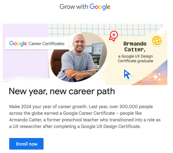 From 2021 through 2024, I was the main copywriter on the Grow with Google newsletter account. I determined the layout by selecting the modules for use in each email, and wrote or edited all content. Click an email below to read in full.